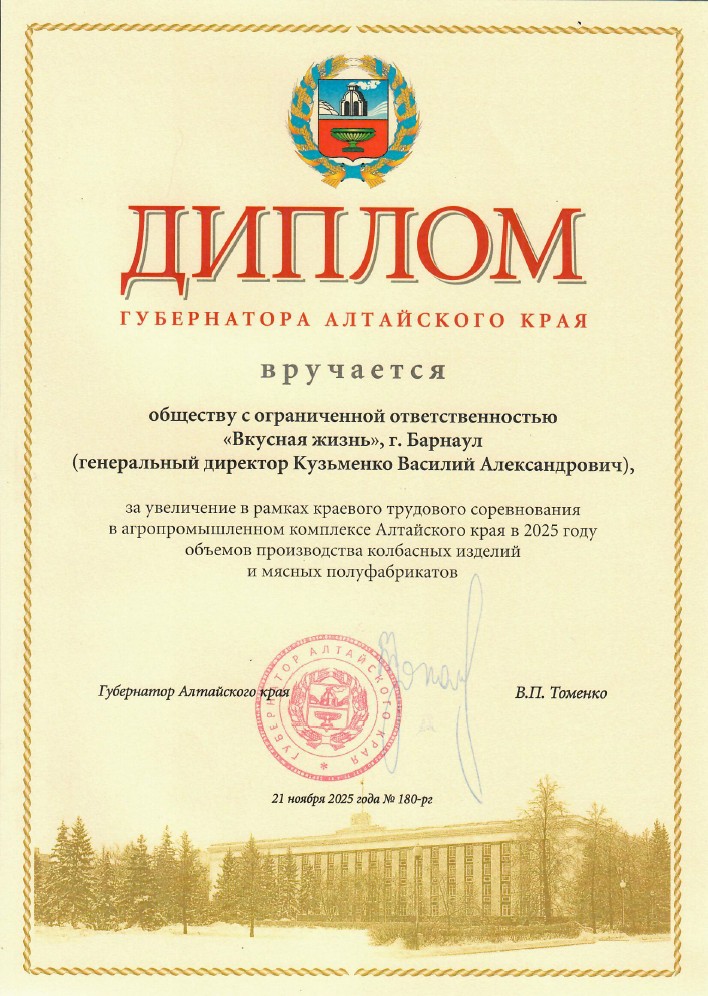 4 декабря 2025 года губернатор Алтайского края вручил награду генеральному директору компании «Вкусная жизнь» Василию Александровичу Кузьмено. Церемония состоялась в рамках торжественного события, посвященного чествованию лучших работников сельского хозяйства и перерабатывающей промышленности.